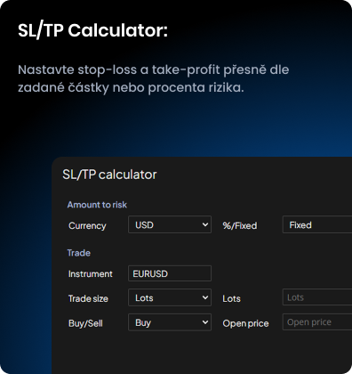 Vypočítejte SL/TP nebo objem obchodu podle pevného rizika nebo procenta. Získejte přesné hodnoty pro bezpečné obchodování.