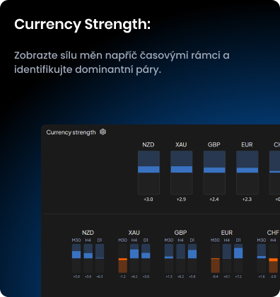 Barevné přehledy a sloupcové grafy vám umožní vidět změny síly na první pohled – bez nutnosti zkoumat každou měnovou dvojici zvlášť.