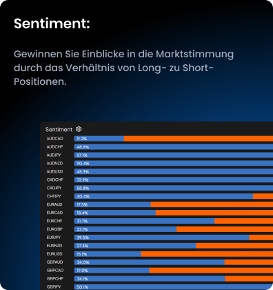 Verfolge in Echtzeit den Prozentsatz von Long- und Short-Positionen – zum Beispiel: 57,6 % Short auf EUR/USD – für ein klares Bild der Marktstimmung.