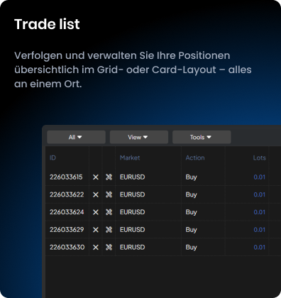 Überwache mehrere Märkte gleichzeitig mit einer kompakten Ansicht – optimiert für Mobilgeräte. Verpasse keine Gelegenheit, egal wo du bist.