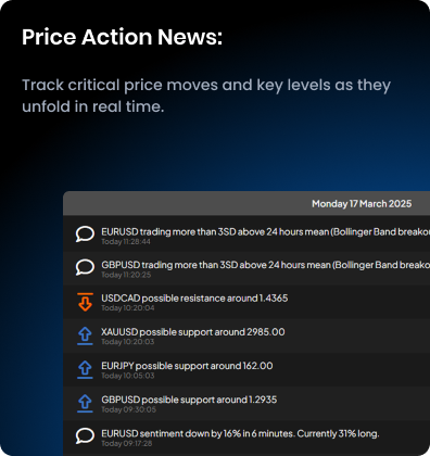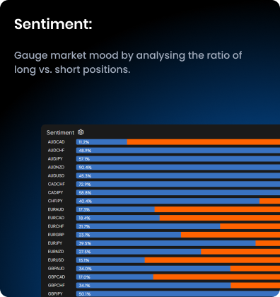 Track the real-time percentage of traders holding long and short positions. Instantly understand the mood of the market—for example, when 57.6% of traders are short on EUR/USD.