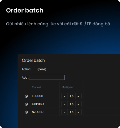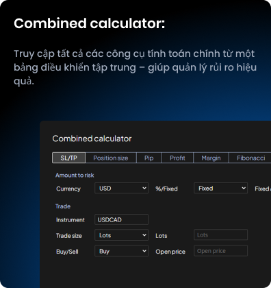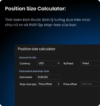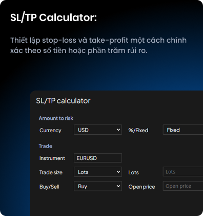 Xác định SL/TP hoặc khối lượng theo mức rủi ro cố định hay theo phần trăm. Công cụ chính xác để kiểm soát tốt hơn.