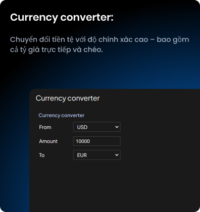 Chuyển đổi tiền tệ tức thì với tỷ giá trực tiếp. Không cần rời khỏi nền tảng hay dùng công cụ bên ngoài.
