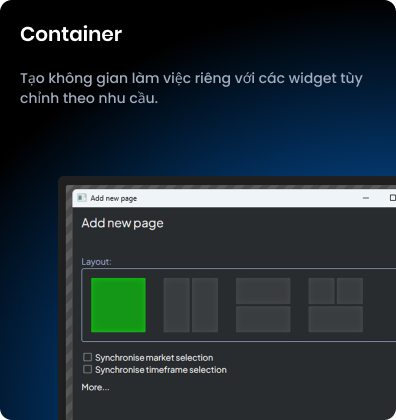 Chuyển đổi giữa các thiết lập nhanh chóng. Luôn giữ môi trường giao dịch gọn gàng và hiệu quả.